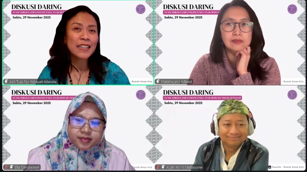 Diskusi daring bertajuk “Atasi Adiksi Games Online pada Anak Usia Sekolah Dasar” yang digelar Ruanita Indonesia pada 29 November 2025 itu menjadi ruang pertemuan lintas negara. Bagi banyak keluarga Indonesia di luar negeri, isu ini terasa semakin dekat. Anak-anak tumbuh dengan gawai di tangan dan akses internet tanpa batas, sementara orang tua sering berada di antara tuntutan pekerjaan dan minimnya dukungan sosial seperti yang biasa mereka dapatkan di Tanah Air.