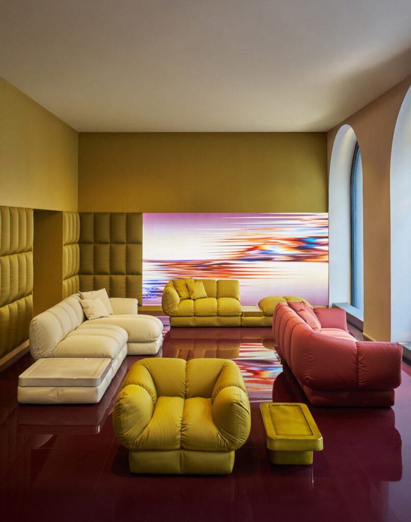Di bawah kubah ikonik, Cassina menghadirkan instalasi “Tanpa Waktu”. Enam furnitur paling emblematik ditampilkan dalam satu palet seragam —velvet warna olio.